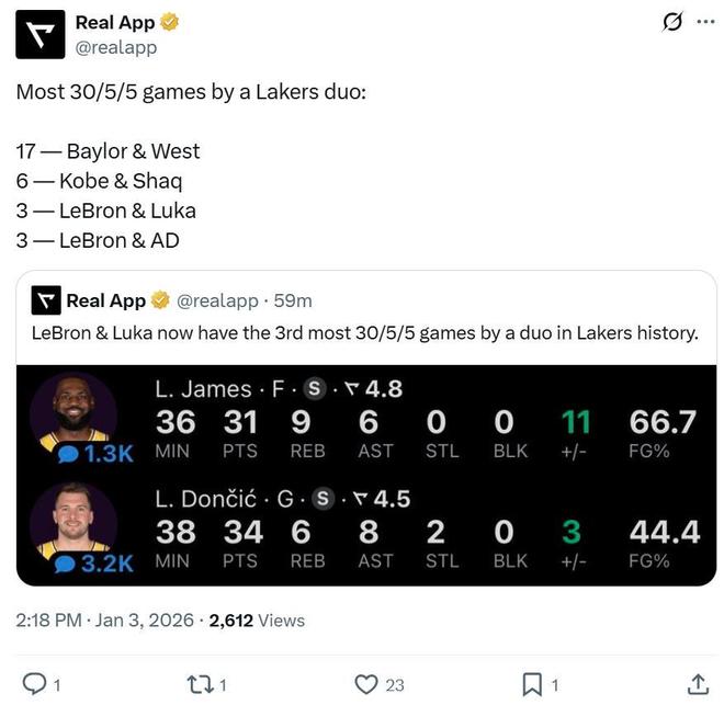他與詹姆斯的進攻表現(xiàn)恰恰是湖人贏球的基本盤,本場是兩人第三次同場轟下至少30+5+5表現(xiàn),追平詹眉并列湖人隊史第三,僅次于OK組合的6次與埃爾金貝勒和韋斯特的17次。