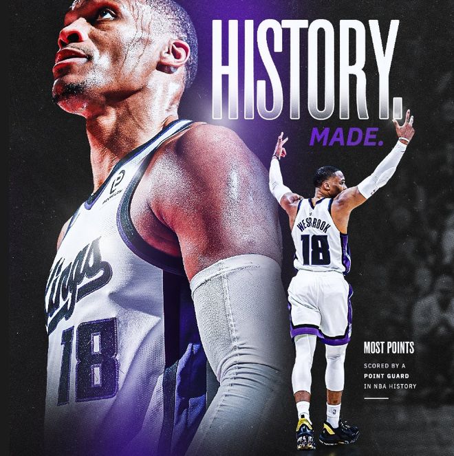 本場比賽,威少貢獻17分、9籃板、6助攻的數據,這讓他生涯常規賽總得分來到26711分,超越傳奇大O,成為NBA歷史控衛得分王!