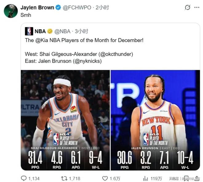 此前,他曾在社媒上發文直言上月東、西部最佳杰倫布倫森和亞歷山大的表現都不如自己。所以,杰倫布朗今日就把痛失東部月最佳的怒火全部發在了快船身上!如此一來,這也就有了杰倫布朗的賽季50+以及帶隊31分狂勝快船。