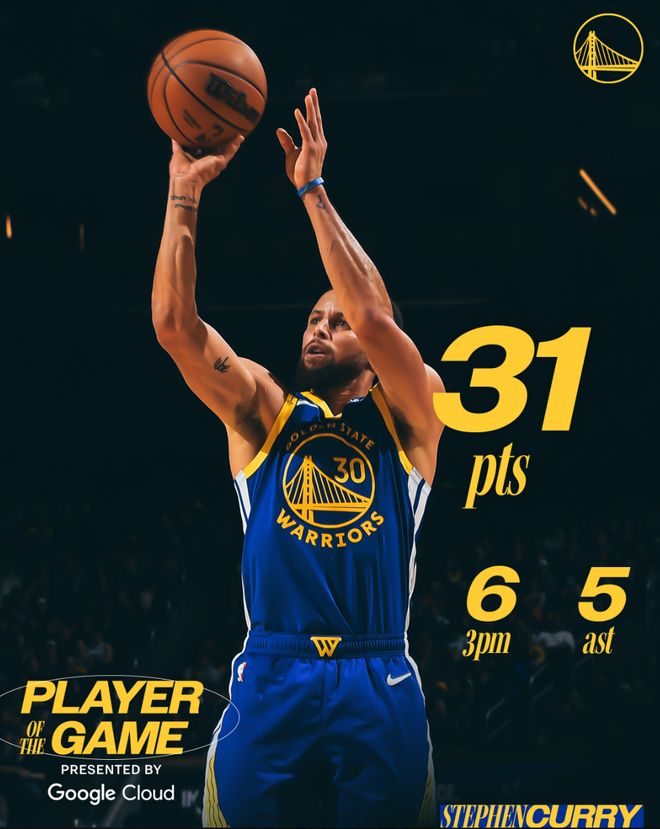 這場比賽庫里34分鐘,18中8,三分12中6,罰球9中9,拿到31分5助攻2籃板1搶斷,命中率44.4%,三分命中率50%,真實命中率70.6%,正負值+5。
