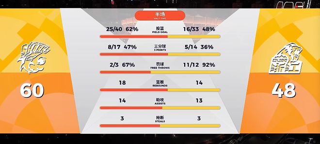 上半場最后時刻,劉錚和古德溫接連命中三分!第二節結束,上海男籃以60-48領先對手12分進入更衣室。