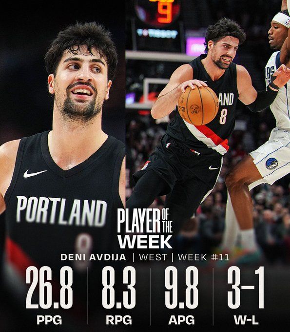 上周,阿夫迪亞率領開拓者隊取得3勝1負的戰績,場均貢獻26.8分、9.8個籃板、8.3次助攻。他也是自2023年2月7日利拉德之后,首位獲此殊榮的開拓者隊球員。