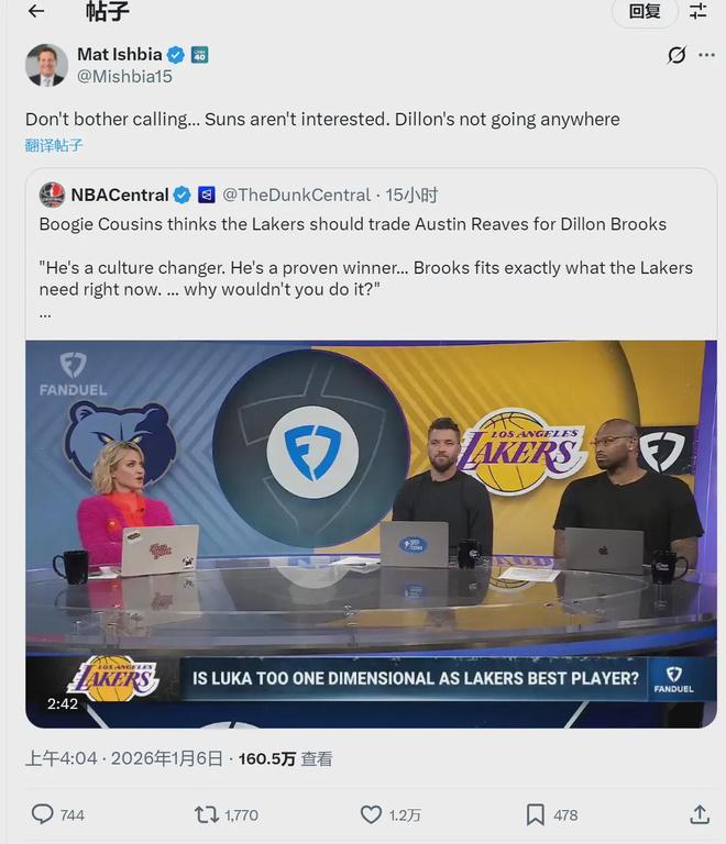 北京時(shí)間1月6日,前NBA球星考辛斯在節(jié)目中說(shuō):“湖人應(yīng)該用里夫斯去換狄龍。狄龍能改變球隊(duì)文化,是一位久經(jīng)考驗(yàn)的贏家,完全符合湖人的需求!”太陽(yáng)老板Mat Ishbia轉(zhuǎn)發(fā)回應(yīng):“別費(fèi)勁打電話了,太陽(yáng)沒興趣交易,狄龍哪兒都不去!”
