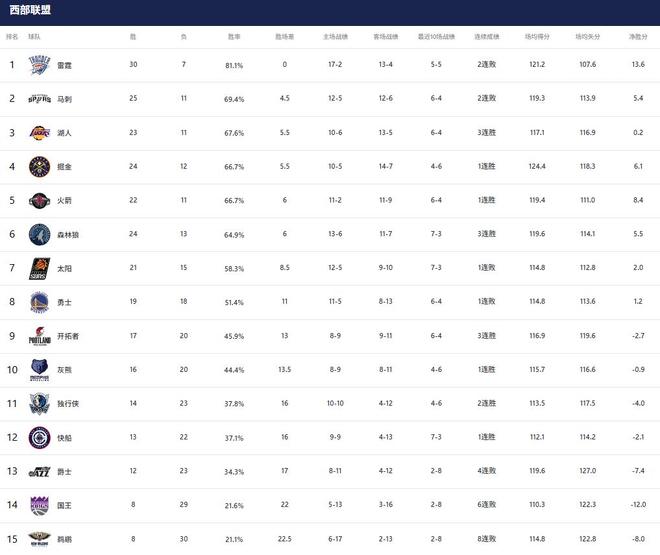 1-3名:雷霆(30勝7負(fù))、馬刺(25勝11負(fù))、湖人(23勝11負(fù))