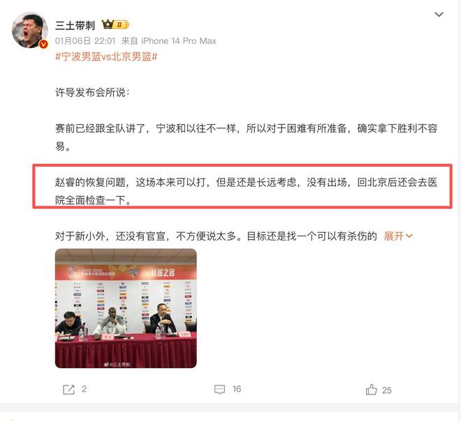 第二個消息,分享一下趙睿傷病更新的情況。各位球迷都知道,趙睿在最近加盟北京隊之后,已經連續幾場沒有打比賽。其實很多球迷都關心他的傷病問題,到底恢復得怎么樣。在最近結束了一場比賽之后,北京隊的主教練在賽后的采訪中主動談到了趙睿的傷病恢復情況。