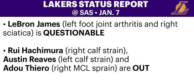 不過在湖人官方更新的他們周四客戰馬刺的傷情報告中,詹姆斯因為左腳關節炎和右坐骨神經痛被列為出戰成疑。此外,八村壘(右小腿拉傷)、里夫斯(左小腿拉傷)以及阿杜-蒂埃羅(右膝內側副韌帶扭傷)仍將因傷缺陣。