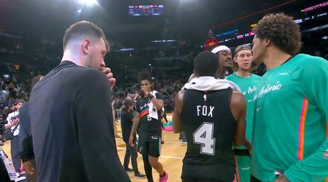 即便終場(chǎng)哨聲早已吹響,湖人和馬刺兩隊(duì)在弗羅斯特銀行中心球館的火藥味仍未消散。本場(chǎng)比賽湖人以91-107不敵馬刺,三連勝的勢(shì)頭被終結(jié)。當(dāng)兩隊(duì)球員陸續(xù)離場(chǎng)時(shí),湖人前鋒范德比爾特與馬刺前鋒索漢發(fā)生口角爭(zhēng)執(zhí),隨后范德比爾特伸手戳向索漢的面部,這一舉動(dòng)立刻引發(fā)馬刺前鋒朱利安?尚帕尼的不滿,后者直接上前將范德比爾特推開,雙方球員險(xiǎn)些因此爆發(fā)大規(guī)模斗毆。