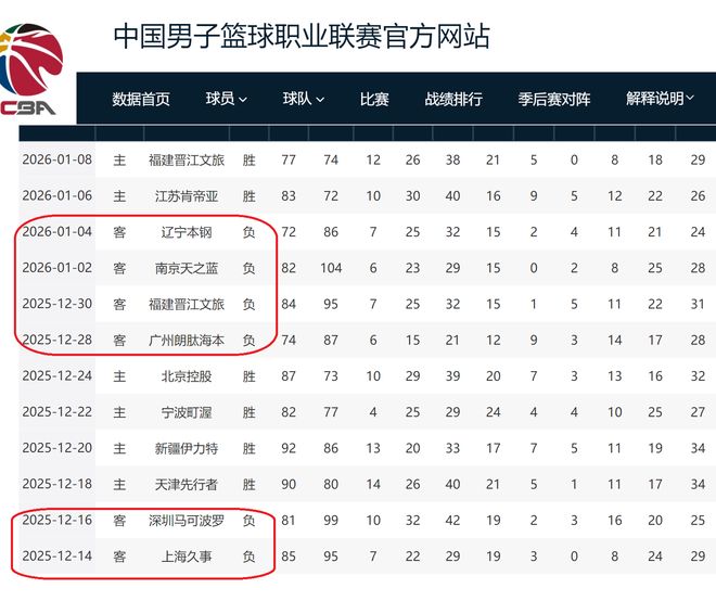 在客場分別輸給了上海隊、深圳隊、廣州隊、福建隊、同曦隊、遼寧隊。