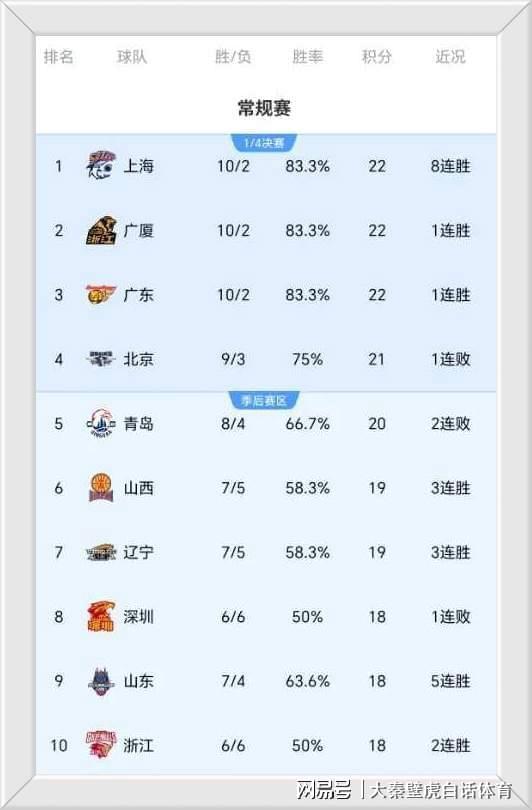 ①、前三名、上海男籃、廣廈隊和廣東隊都取得10勝2負的戰績排名前三;
