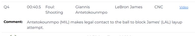 最后40.5秒,字母哥對詹姆斯的上籃嘗試進行了合法封蓋。(注:報告上沒有提到打到詹姆斯手的特納)