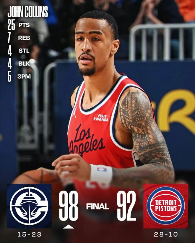 快船客場98-92艱難逆轉底特律活塞,本賽季完成對這支東部榜首球隊的“雙殺”。本場扎克·科林斯14投9中,三分球8中5,砍下25分、7個籃板,更恐怖的是送出了4次搶斷和4記封蓋,正負值高達+19冠絕全場。一份25+7+4+4的華麗數據單,讓他成為快船隊史繼“船長”埃爾頓·布蘭德之后,第二位達成此成就的球員。