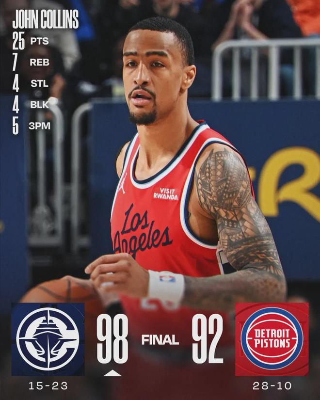 北京時間1月11日,NBA常規賽:快船客場98-92逆轉活塞,本賽季雙殺東部第一。快船內線科林斯表現出色,投籃14中9,三分8中5,罰球4中2,砍下25分7籃板1助攻4搶斷4蓋帽,正負值+19全場最高。最近11場比賽,快船9勝2負。