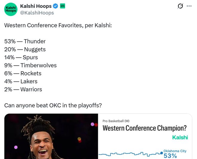 火箭隊6%僅排第五!在常規賽程過半,全明星周末即將到來之際,西部冠軍概率更新出爐,其中湖人4%、勇士2%、掘金20%屈居第二,雷霆超5成斷檔第一。