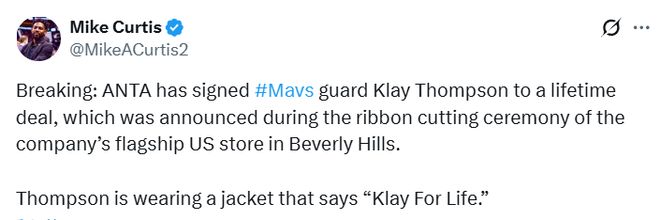 離開金州勇士、告別冠軍搭檔庫里后,他一度處境艱難,但如今在達拉斯找到了新歸宿。賽場內外都蒸蒸日上:庫珀-弗拉格新秀賽季便驚艷世界,而克萊與說唱歌手梅根-西-斯塔里昂的戀情曝光,也讓這位神射手一夜之間成為八卦媒體焦點?,F在,克萊又多了一個開心的理由——他在洛杉磯全明星周末上,正式宣布與安踏簽下終身球鞋合約。