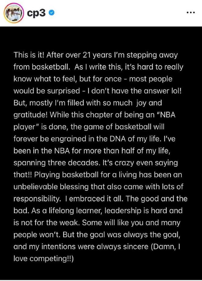 就這樣,在經歷超過21年NBA生涯后,我將告別籃球生涯。當我寫下這些文字,我確實很難真正去體會內心情感,但這一次大多數人可能會感到驚訝,對此我并沒有答案。