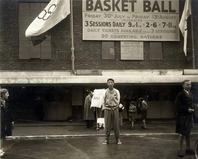 1948年吳成章在倫敦奧運會賽場外留影