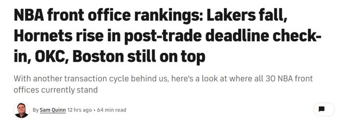 常規(guī)賽過半進(jìn)入全明星周末之際,美媒《CBS》根據(jù)本賽季前半程最新表現(xiàn)重新評價NBA各隊管理層水平排名,其中雷霆隊毫無疑問高居第一,陷入困境的火箭隊仍高居第3,勇士隊17名,湖人僅排25位。