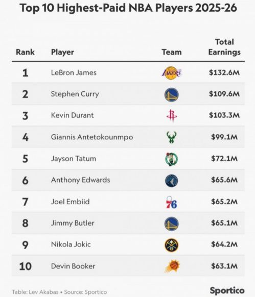 北京時間2月21日,美媒Sportico公布2025-26賽季NBA總收入(NBA年薪+場外代言收入)最高前十球員榜單,詹姆斯以1.326億美元高居榜首,庫里與杜蘭特分列二三位,他們也是僅有的3位超過1億美元收入球員。