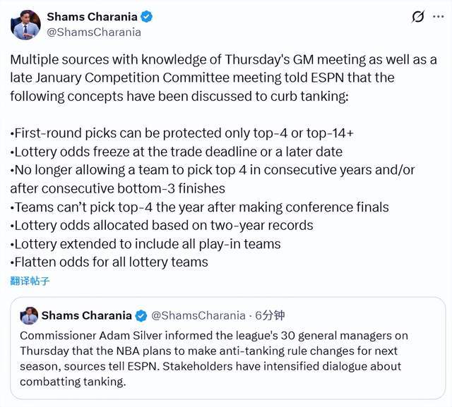 多位了解總經理會議及1月末競爭委員會會議的消息人士向ESPN表示,目前討論的反擺爛方案如下——