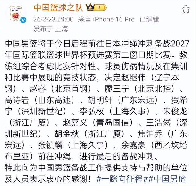 就在本次窗口期比賽前,中國男籃終于官方公布了14人名單,其中包括了胡明軒、趙繼偉、趙睿、高詩巖、賀希寧、李弘權(quán)、朱俊龍、趙嘉義、王浩然、胡金秋、焦泊喬、張鎮(zhèn)麟、余嘉豪、廖三寧。