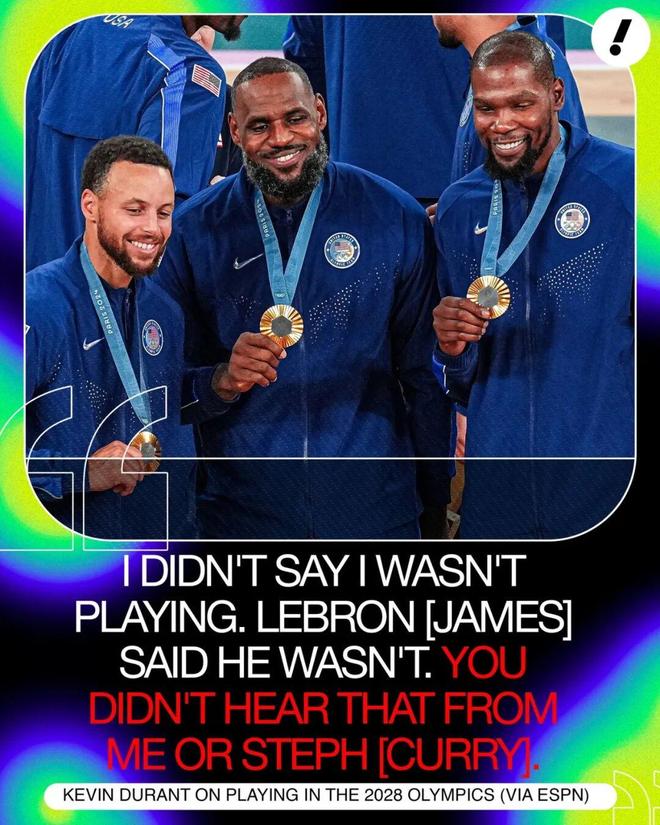 此前巴黎奧運會,杜蘭特、詹姆斯、庫里三位老將帶領美國男籃奪冠,當時外界一度認為,這將是三位傳奇的奧運會謝幕之旅,杜蘭特在采訪里否認了這一說法。