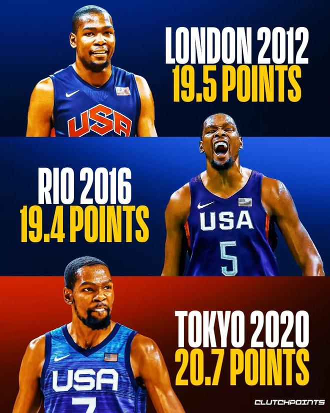 杜蘭特是美國男籃奧運會的歷史得分王,也是隊史當之無愧的第一人,他一共參加過四屆奧運會,四次全部拿到金牌,且前三次都是隊內得分王: