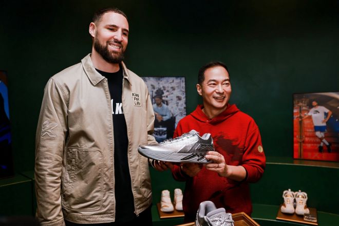在北美旗艦店開業當日,代言人克萊·湯普森與KT11特別版球鞋合影 圖片來源:安踏官方