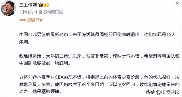 北京時間2月24日,根據中國臺北媒體的報道,鋒線球員周桂羽因傷臨時退出,只有15人參加了集訓。