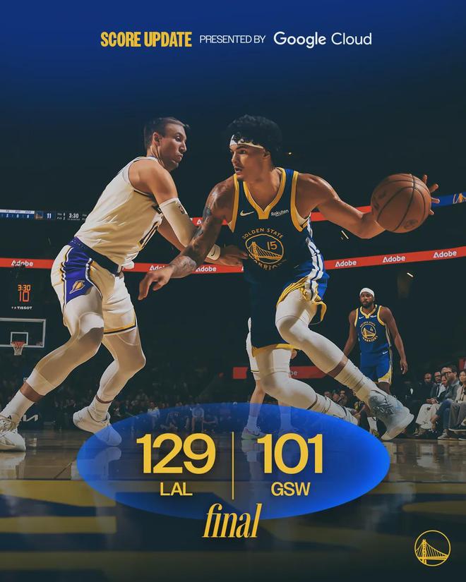 湖人第三節再砍34分,前三節得分均在32分以上。三節戰罷,湖人99-72領先勇士27分。第四節追夢連砍5分,但是對比賽已經沒有任何影響,分差一直在30分左右。最后7分多鐘,兩隊換上替補。全場結束,湖人129-101大勝勇士。