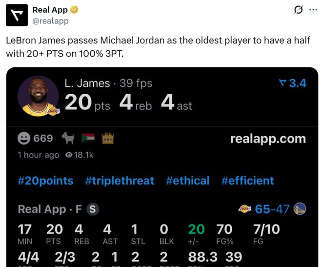 這讓41歲61天的詹姆斯超越喬丹,成為NBA歷史上能夠半場拿到20+,且三分命中率100%最老的球員。