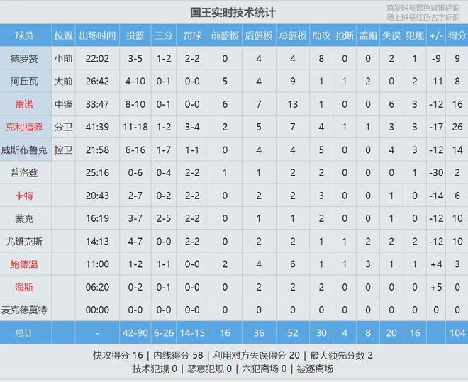 湖人首發:東契奇、里夫斯、斯瑪特、詹姆斯、艾頓。國王首發:威少、克利福德、德羅贊、阿丘瓦、雷諾。威少開局手感不佳,首節5中1僅得2分3助攻3失誤。國王全隊三分球5中0,第一節打完,湖人36-18領先國王18分。