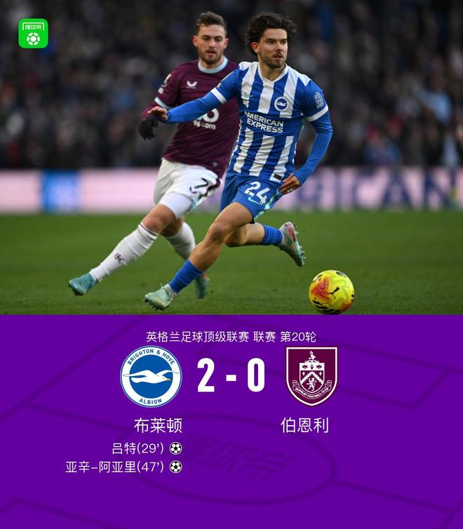 北京時間1月3日,英超聯賽第20輪展開較量,布萊頓坐鎮主場迎戰伯恩利。上半場,科斯圖拉斯送出精準助攻,呂特抓住機會率先打破僵局。下半場,亞辛-阿亞里再下一城,卡迪奧盧上演門線解圍。最終,布萊頓主場2-0戰勝伯恩利。