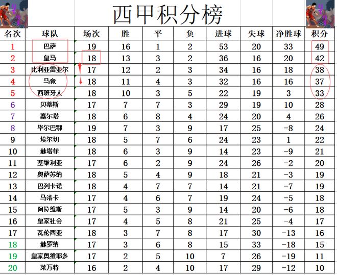 積分榜方面,巴薩先賽贏球后豪奪西甲9連勝,暫時將和皇馬的差距拉大到7分,這半程冠軍是相當的穩固。比利亞雷亞爾及時止住頹勢,贏球后超過馬競1分重回前3。西班牙人無力在巴薩身上搶分,還是差馬競4分位列第5。