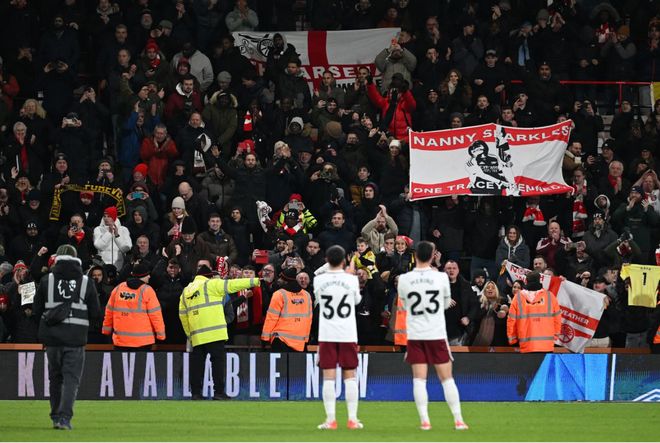 客場球迷的反應(yīng)也頗具意味。第10分鐘失誤后,球員走回中圈時(shí),球迷已高聲唱起加布里埃爾的助威歌——不久之后,他們再次高歌,原因已截然不同。