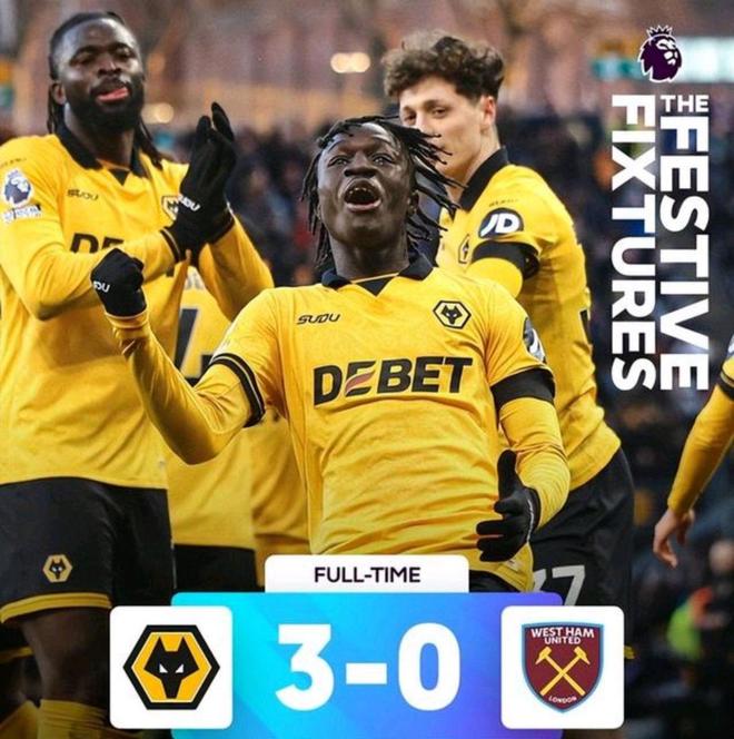 落后的西漢姆聯試圖組織反擊,但在狼隊嚴密的防守下,并未創造出太多絕對得分機會。反而是在第30分鐘過后,狼隊擴大了領先優勢。馬特烏斯·馬內在前場表現得非常活躍,他利用個人能力在禁區內制造了混亂,迫使西漢姆聯防守球員犯規,裁判果斷判罰了點球。黃喜燦當仁不讓地站在點球點前,冷靜主罰命中,將比分優勢擴大為2-0。僅僅過了十幾分鐘,狼隊卷土重來,上半場尾聲階段,馬特烏斯·馬內再次成為比賽的主角,他在禁區外得球后稍作調整,隨即起腳低射,皮球如穿云箭般鉆入球門死角,場上比分瞬間來到了3-0。上半場結束時,狼隊已經取得了三球的領先優勢,基本鎖定勝局。