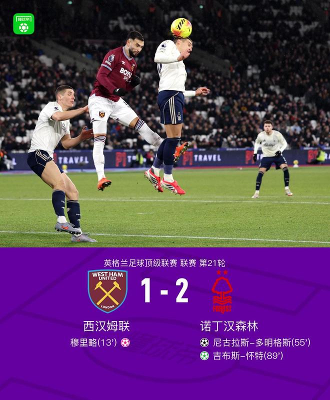 北京時間1月7日,英格蘭足球超級聯賽第21輪,西漢姆聯主場迎戰諾丁漢森林。比賽中,穆里略不慎自擺烏龍,為對手率先取得入球。隨后,埃利奧特-安德森送出助攻,尼古拉斯-多明格斯接應破門,幫助球隊扳平比分。臨近比賽結束前,諾丁漢森林獲得點球機會,吉布斯-懷特主罰命中,完成逆轉。最終,諾丁漢森林客場2-1逆轉西漢姆聯。
