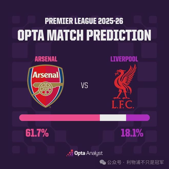 權威數據機構OPTA對本場結果的預測是阿森納勝率超六成(61.7%),利物浦勝率不足兩成(18.1%)。