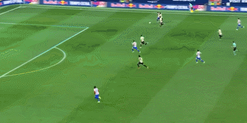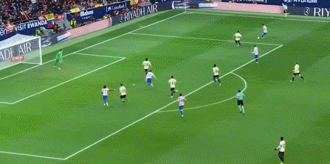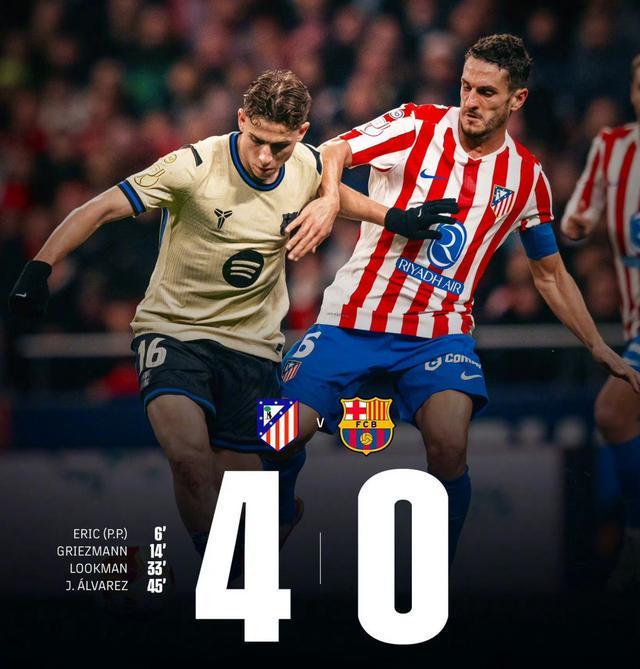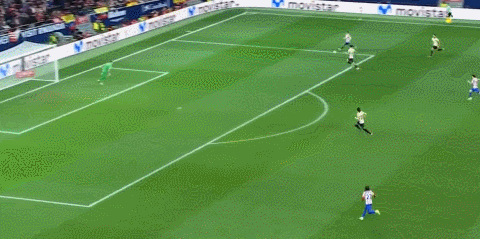 上半場補時第2分鐘,盧克曼得球橫傳,阿爾瓦雷斯跟進爆射破門,比分4-0,馬競40分鐘連入4球!