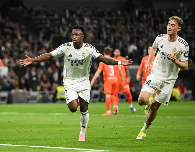 在兩支球隊最近的5次聯賽對決中,皇馬保持全勝,為了延續(xù)強勢的發(fā)揮,阿韋洛亞在主場擺出了442的陣型,首發(fā)門將庫爾圖瓦,卡雷拉斯、赫伊森、呂迪格和阿諾德構筑后防,卡馬文加、瓊阿梅尼、居萊爾和巴爾韋德坐鎮(zhèn)中場,雙箭頭則是維尼修斯搭檔貢薩洛加西亞,姆巴佩則在替補席上待命。