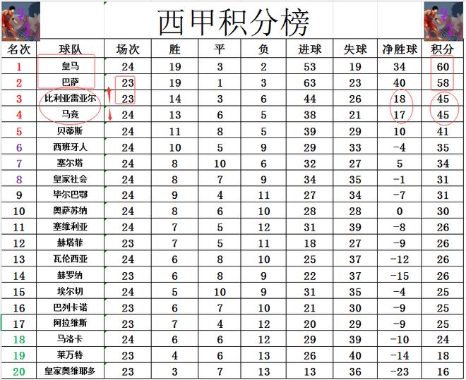 積分榜方面,皇馬昨天大勝后,先賽的情況下超過巴薩2分登頂。馬競今天客場慘敗給保級弱旅,遭遇2連敗,近3輪只拿到1分,已經是落后皇馬多達15分,基本上已經是退出爭冠。隨著馬競慘敗,比利亞雷亞爾凈勝球超過馬競1球,躺著升到第3。