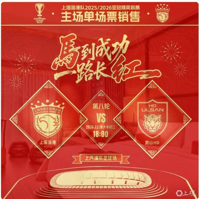 2 月 18 日 18 時,農歷馬年正月初二,作為中超三冠王的上海海港隊將在上汽浦東足球場迎戰韓國蔚山 HD 隊,這也是球隊在亞冠精英聯賽小組賽的收官之戰。
