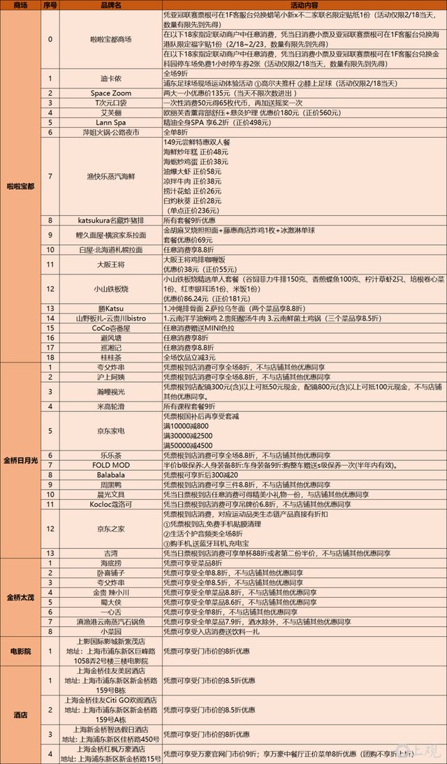 受到公共交通、地理位置限制,上汽浦東足球場周邊的餐飲、娛樂場所不多,最近的是金橋鎮附近的一些商業體。據悉,這場亞冠收官戰,上汽浦東足球場和金橋站展開聯動,包括 LaLaport 上海金橋、金橋日月光中心、金橋太茂商業廣場、新紫茂等核心商業體,都會攜手周邊酒店、影院及文體消費場景,共同推出服務海港球迷的專屬禮遇。一場比賽,全域優惠,球迷憑此賽事票根,暢享吃喝玩樂。