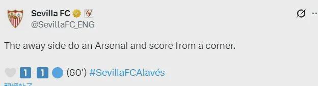 塞維利亞官推在更新比賽比分時揶揄了一把阿森納,他們寫道:“客隊(阿拉維斯)像阿森納那樣,打進了一粒角球。”