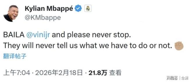 接著,姆巴佩又發(fā)文道:“跳舞吧,維尼修斯,永遠(yuǎn)不要停下來。他們永遠(yuǎn)無法告訴我們該做什么或不該做什么。”