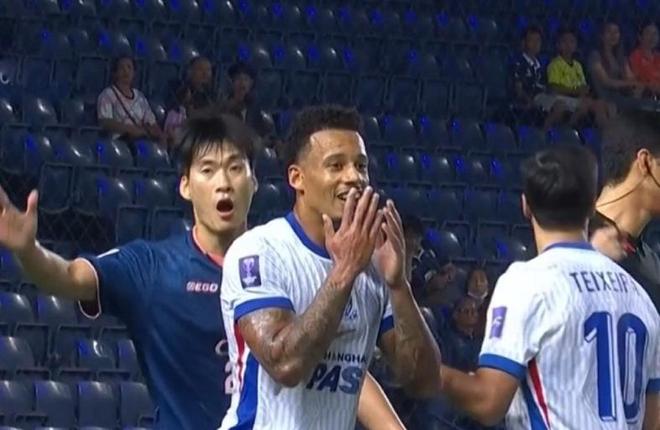 第22分鐘,武里南聯(lián)又抓住了角球進(jìn)攻,右側(cè)角球開禁區(qū)之后,朱辰杰頭球解圍,隨后素帕那一記精彩抽射破門,申花0-2!