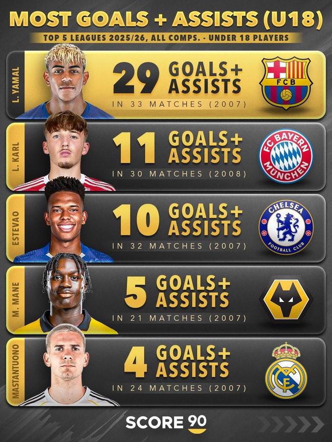 北京時間2月24日,Score 90統計出了本賽季至今歐洲五大聯賽U18球員各項賽事直接參與進球數的排行榜,亞馬爾29球斷檔領先,倫納特-卡爾11球第二,埃斯特旺10球第三。