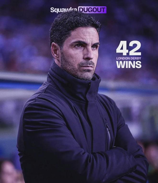 Squawka統(tǒng)計,在執(zhí)教參加20場以上倫敦德比的教練中,阿爾特塔是勝率最高的:60.8%。