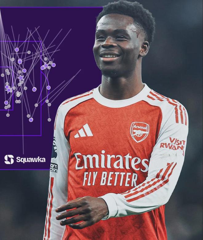 Squawka統(tǒng)計,本賽季薩卡在英超聯(lián)賽中完成了46次帶球過人并創(chuàng)造了46次機(jī)會,這名球星也是聯(lián)賽中唯一一個成功帶球過人和創(chuàng)造機(jī)會次數(shù)40+的球員。