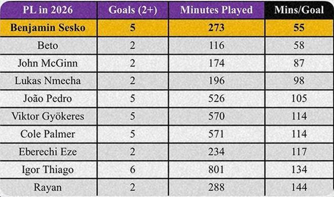 在卡里克執教的第6場比賽中,被看好首發的謝什科仍然作為替補出場。其他同齡球員可能因此悶悶不樂,但這位斯洛文尼亞前鋒選擇不發表怨言,而是用表現來說話。7次出場打入6球,謝什科成為英超狀態最好的射手之一,2026年還沒有哪位球員在英超的非點球進球數超過他的5個。